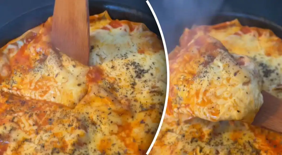 Kolejnym krokiem jest zalanie masy sokiem pomidorowym i ułożenie płatów lasagne na patelni tak, aby lekko „utonęły” w płynie. Po kilku minutach posypujemy leniwą lasagne serem i zostawiamy pod przykryciem na ogniu, aż wszystkie składniki będą w pełni ugotowane.